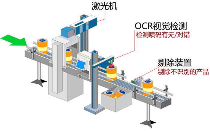 4、在喷码标识阶段可以选择小字符喷码机、激光喷码机、高解析喷码机、热转印喷码机等设备,根据产品标识内容与解析度要求而定。检测实现方式模块可选视觉相机检测、视觉传感器检测、二 维码读码器检测、条码扫描仪检测、RIFD射频检测。